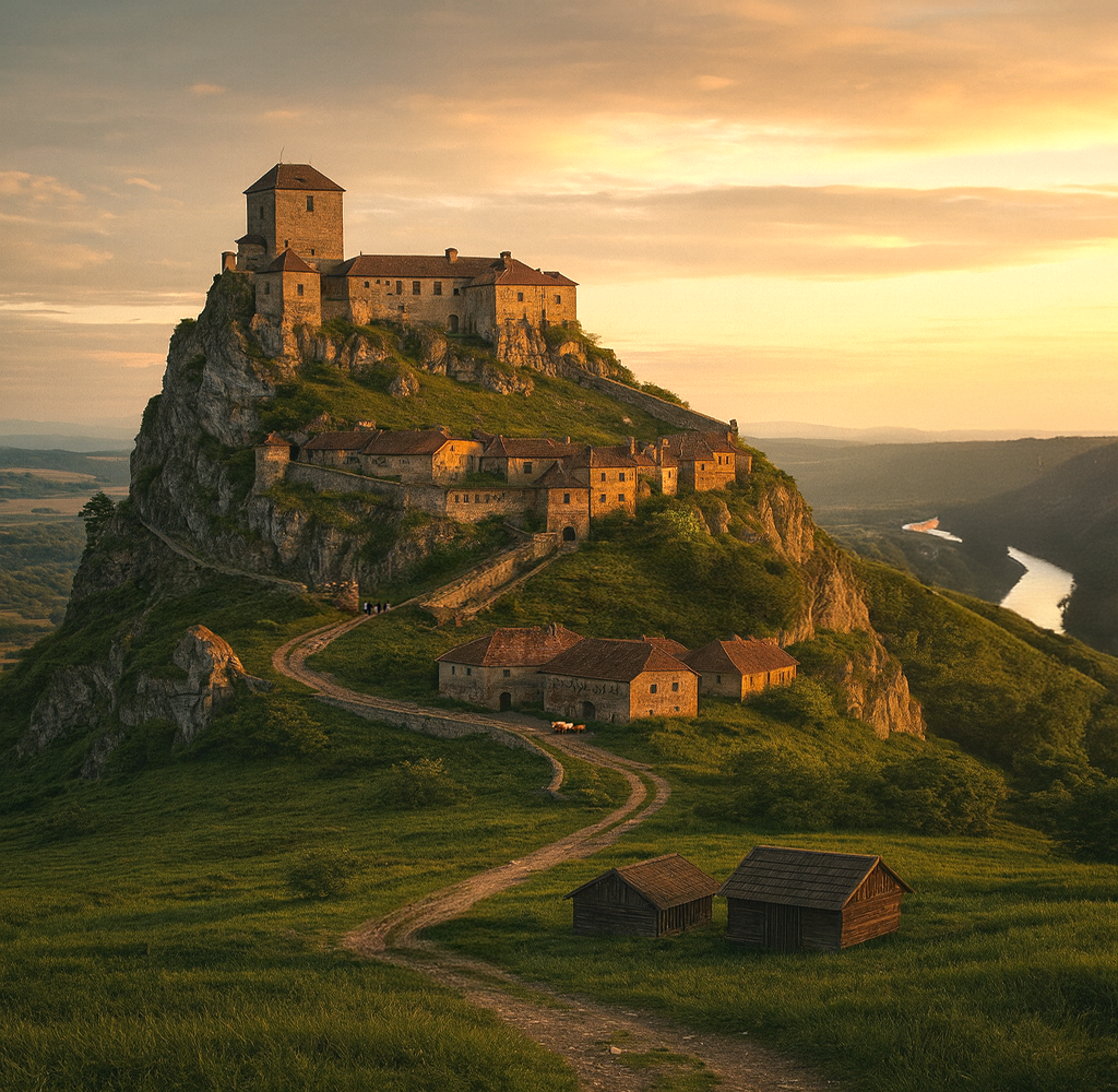 Vizualizacija gradu Kostel, 17. stoletje (www.mojaslovenija.si, lastne panoramske fotografije + stare upodobitve + generativna AI(UI) )